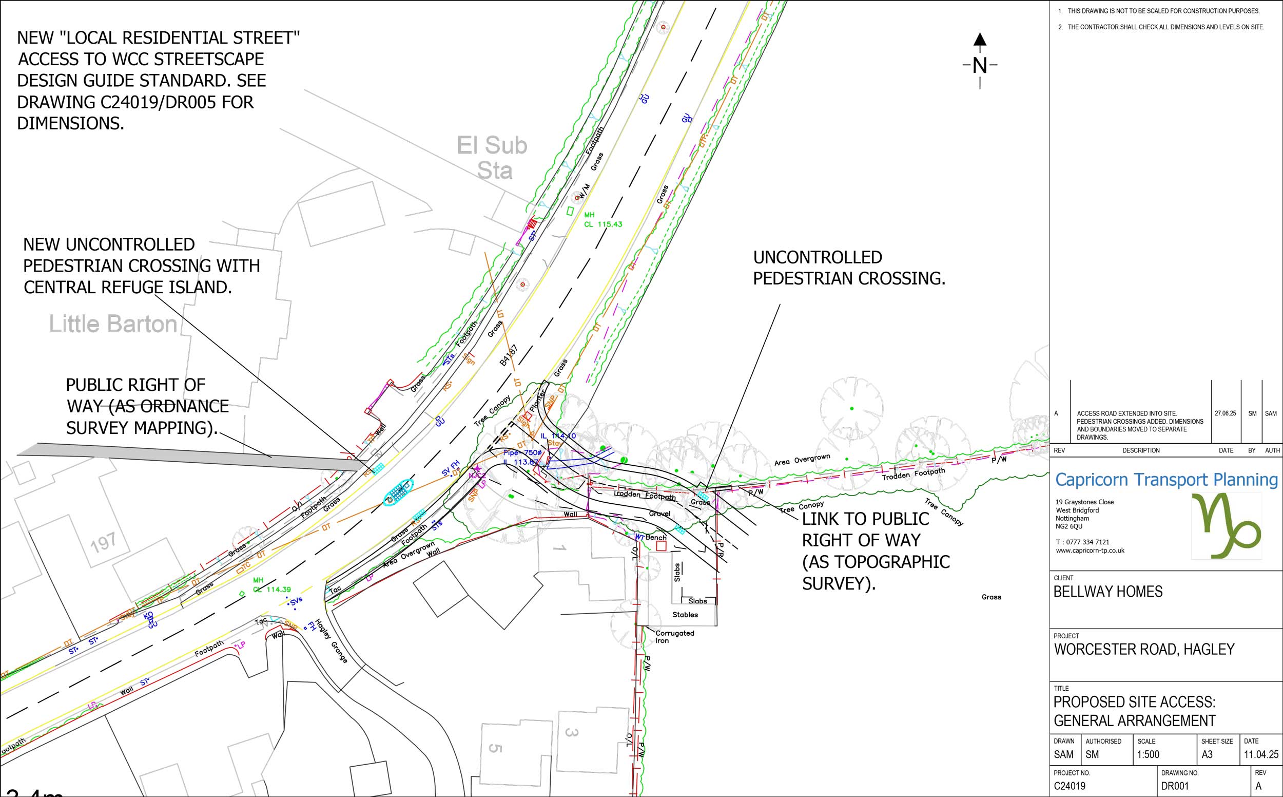 - A new 2.0m wide footway that will run along the southern side of the proposed new road, featuring an internal uncontrolled crossing to safely link pedestrians to the existing public right of way on the northeastern side.
